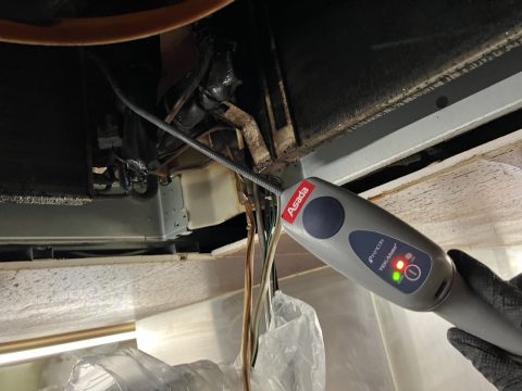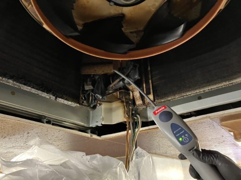 早速冷媒ガスが何処で漏れているか確認をするためにガス漏れ検知器にてガス漏れ検査を行いました。